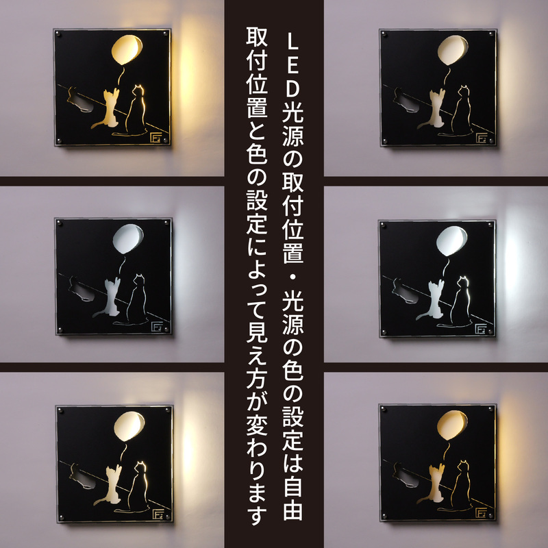 岐阜鉄の匠 【国産/日本製】 鉄脚 スチール アイアン ウォールデコ 壁飾り 壁掛けアート作品 風船と猫 3層構造 (黒/白/グレー) LED光源付 撥水加工
