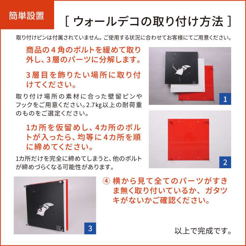壁固定ピンなどでベニヤまたは石膏ボードの壁面の固定できます。フックなどを使用すれば、絵画のように吊りヒモで掛けることも可能です。