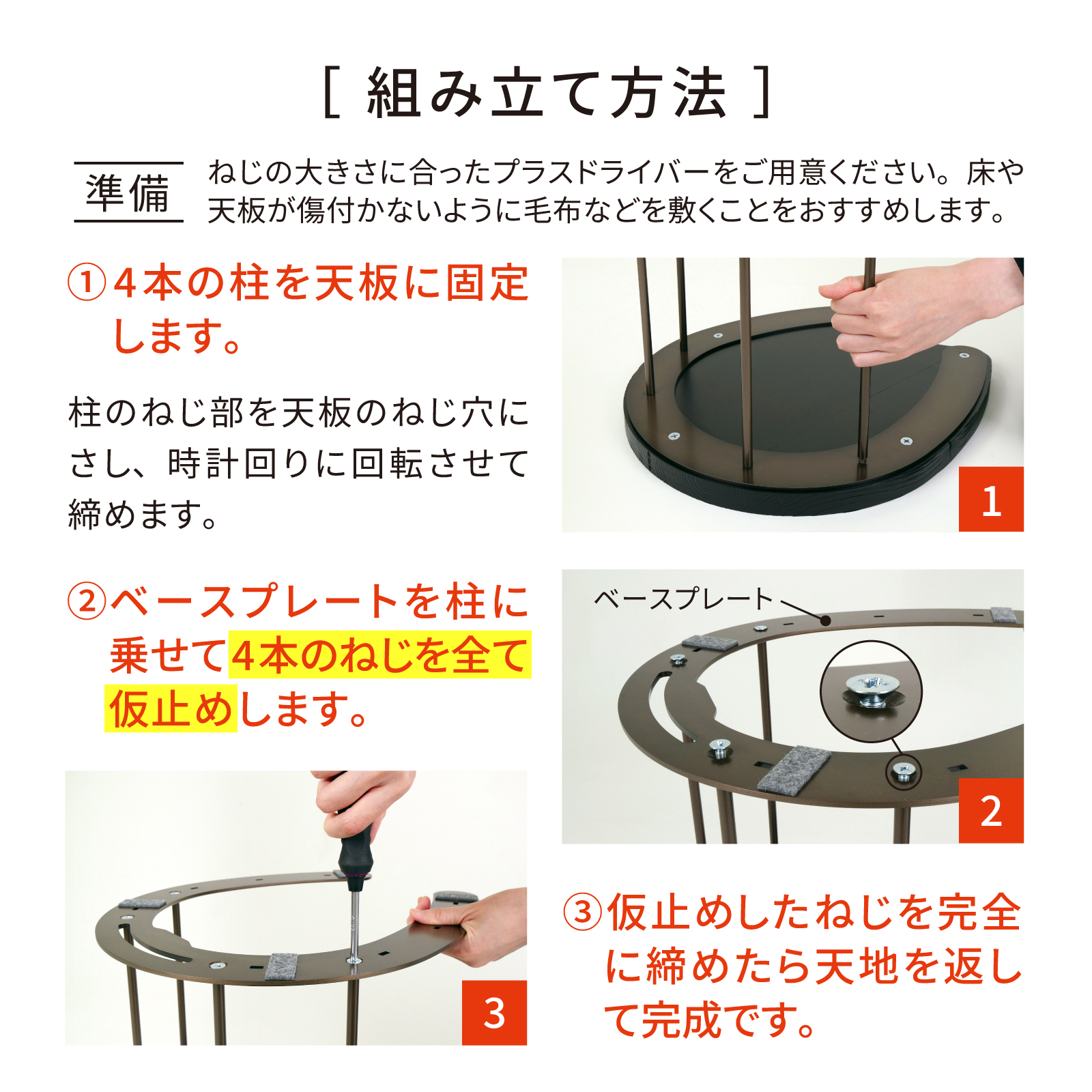 組立方法:柱をねじ込み後ボルト固定 / 付属品:M6ネジ×4個