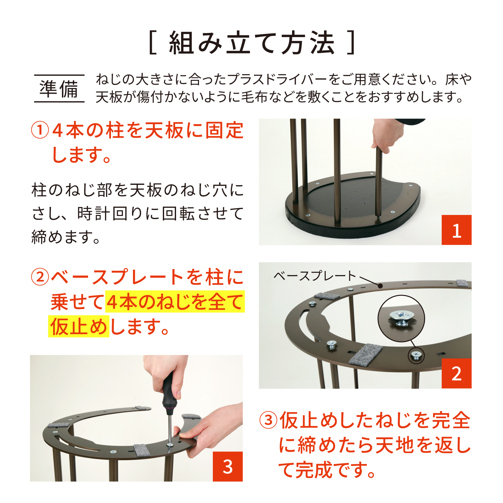 組立方法:柱をねじ込み後ボルト固定 / 付属品:M6ネジ×4個